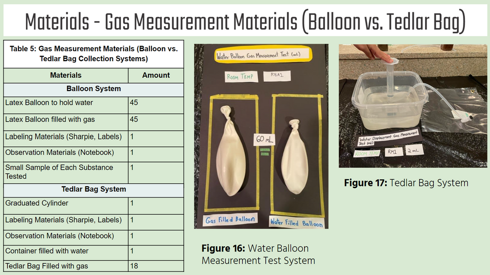 Both bottles formed mold after Day 2. The Tedlar Bag bottle formed more mold than the Balloon bottle. Tedlar bag was slower to collect gas compared to the balloon. It is possible that gas could have been trapped in the plastic tubing connecting the bottle to the bag. The tube might have been too long and it might have been more difficult to move the gas through from the bottle to the bag. These are possible sources of experimental error.