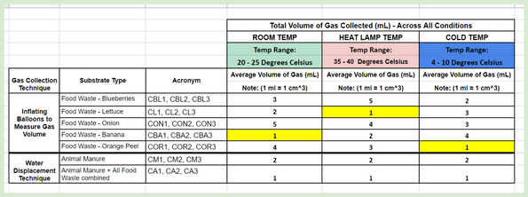 The Maximum amount of gas at Room temperature was from banana at 53.67 mL. The maximum amount of gas from the heat lamp environment was 23.67 mL. The maximum amount of gas produced from the cold temperature was significantly less at only 11.67 mL.