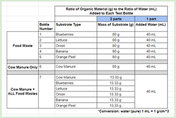 Source and method of manure and food waste processing (farm), Weight of Biomass (grams), Biomass to water ratio (2:1), Retention time for biogas collection (days), Lab Testing Materials, Safety Equipment, Data Recording Materials / Utensils.